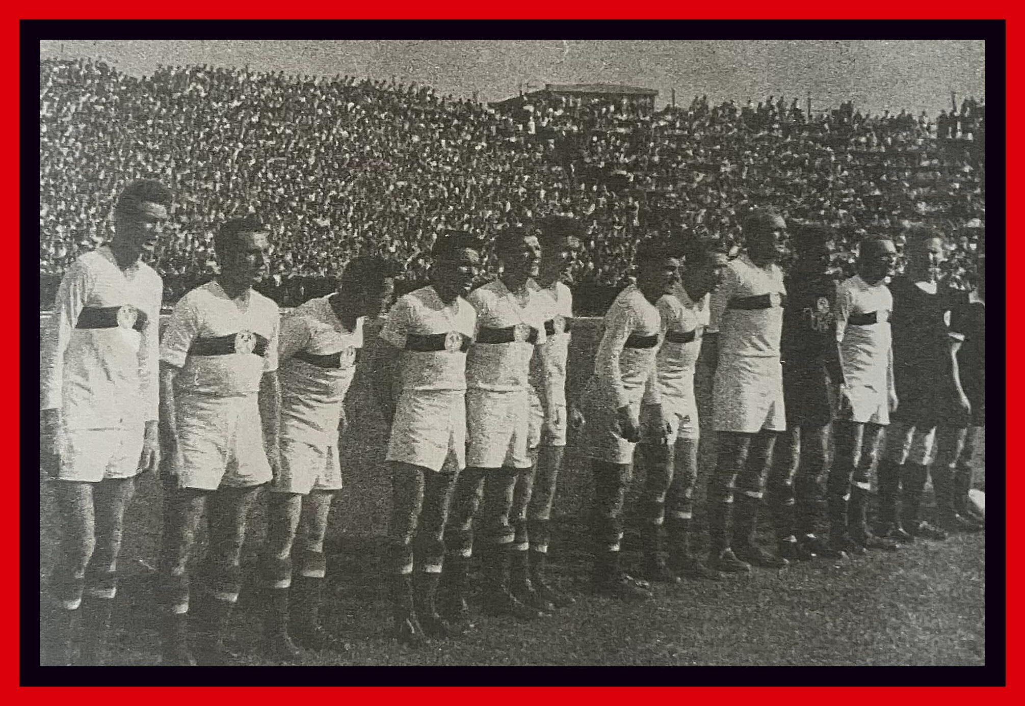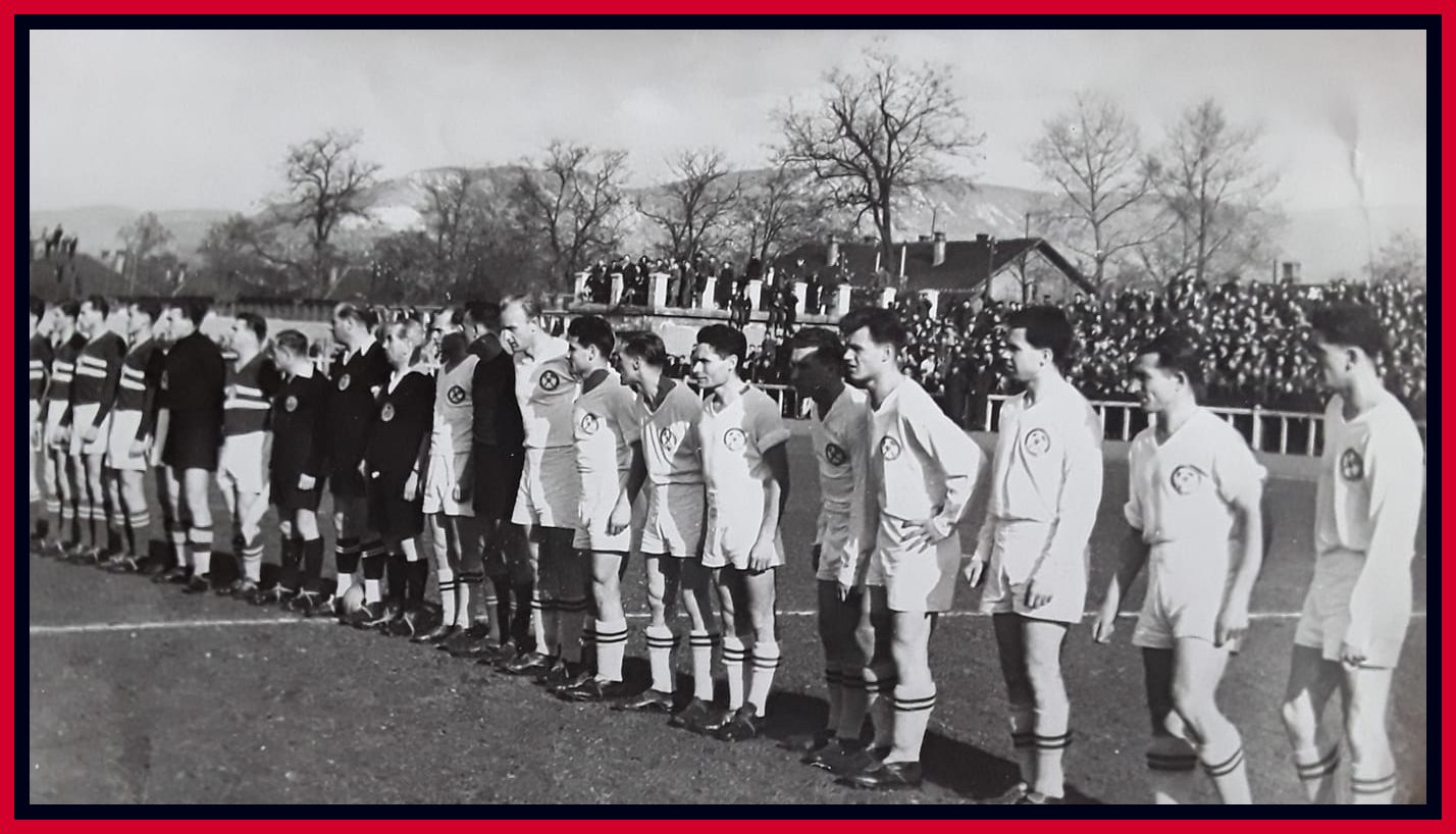 A Honvéd elleni meccs előtt felsorakozva, Ilku Péter jobbról az első, míg az ellenkező oldalon a játékvezetői hármas balján Puskás, majd Grosics.