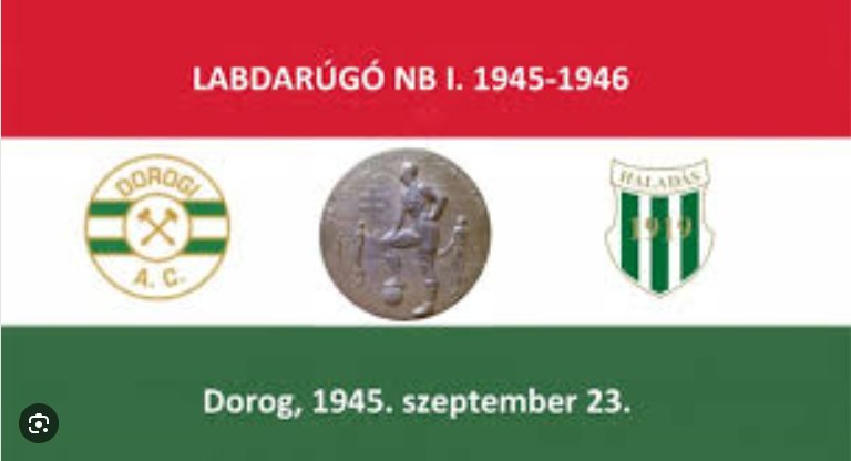 Borítókép: A Dorog és a Haladás 1945-ben használatos címere, valamint korabeli MLSZ érme a nemzeti zászlóba foglalva, a mérkőzés dátumával.