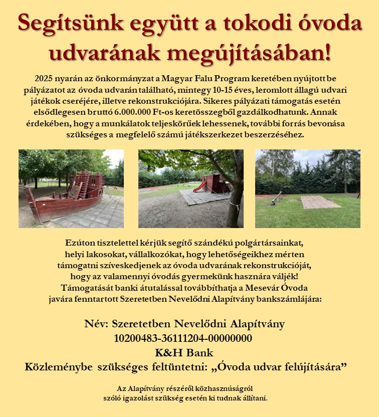 2025 nyarán Tokod Nagyközsés Önkormányzata a Magyar Falu Program keretében nyújtott be pályázatot az óvoda udvarán található, mintegy 10-15 éves, leromlott állagú udvari játékok cseréjére, illetve rekonstrukciójára.