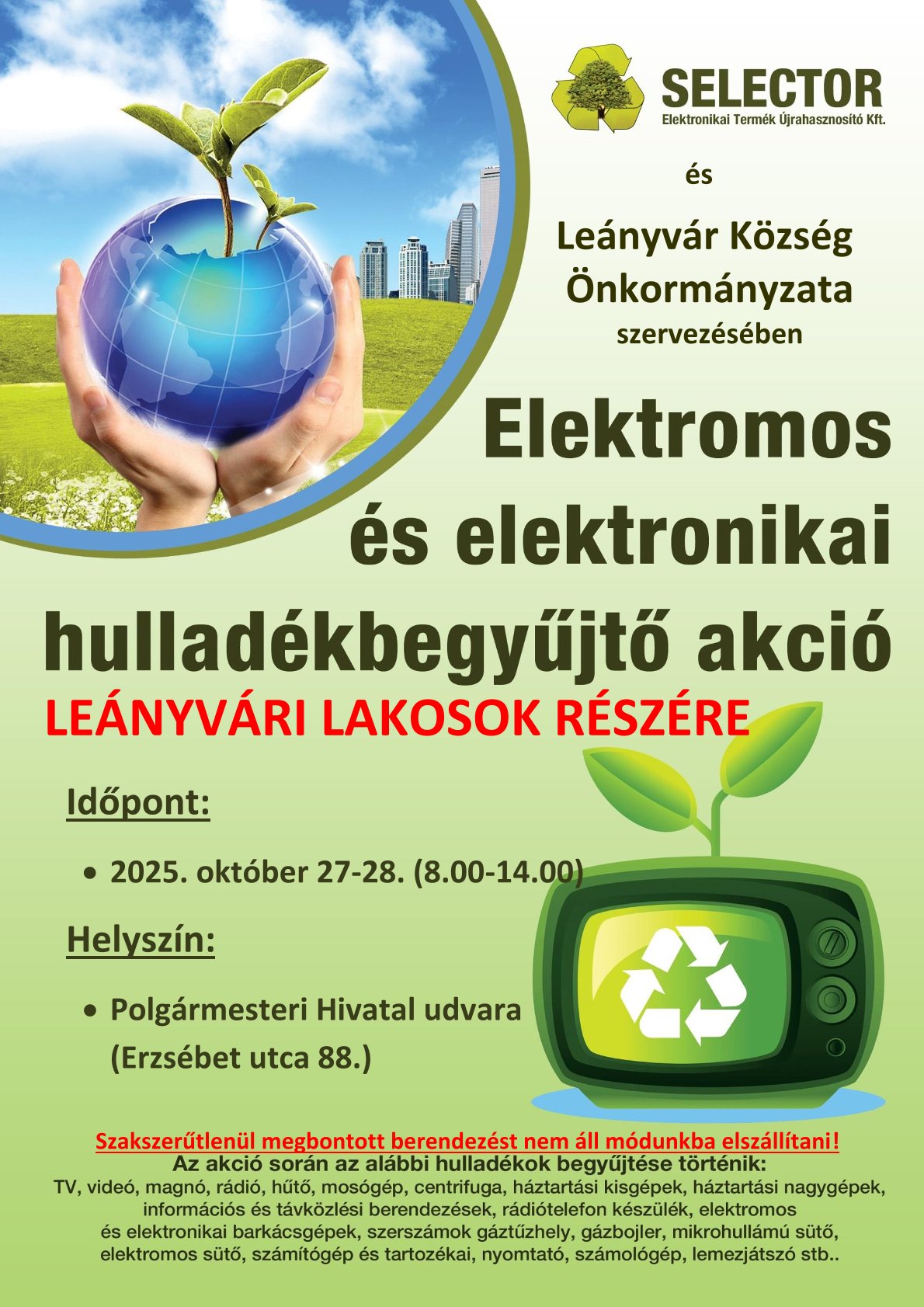 Október 27-én és 28-án, 8 és 14 óra között elektromos és elektronikai hulladékgyűjtési akciót szervez a Selector Elektronikai Termék Újrahasznosító Kft. és Leányvár Község Önkormányzata helyi lakosok részére a Polgármesteri Hivatal udvarán.