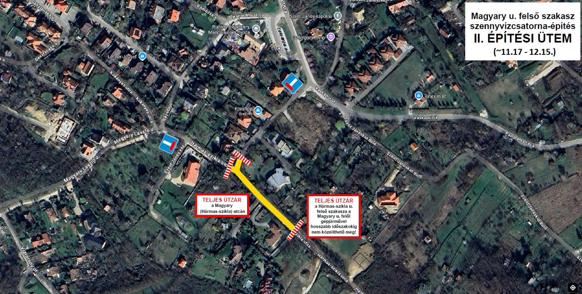Esztergom Megyei Jogú Város Önkormányzata tájékoztatja a lakosságot, hogy a Magyary László utcában zajló szennyvízcsatorna-építési munkálatok miatt 2025. november 17-től december 15-ig teljes útzár lesz érvényben a munkaterületként kijelölt szakaszon.