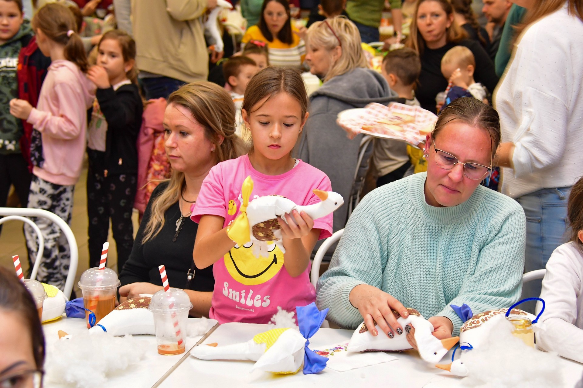A rendezvény különleges nyitánya a „libatömés” volt – természetesen játékos formában. A résztvevők előre megvarrt libákat tölthettek meg tetszés szerint, így születtek meg a kék lábú, piros masnis és más ötletes, egyedi libafigurák. A kézműves asztaloknál lámpások, rajzok és különféle kreatív alkotások készültek, amelyek az esti felvonuláson is szerepet kaptak.