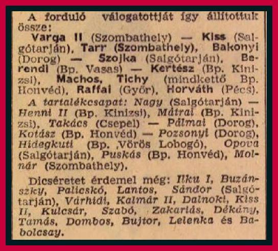 Az utolsó forduló válogatottja. Összesen öt dorogi játékos szerepel a kiemeltek között (forrás: Tempó Fradi! – 1955. december 11. – www.tempofradi.hu).