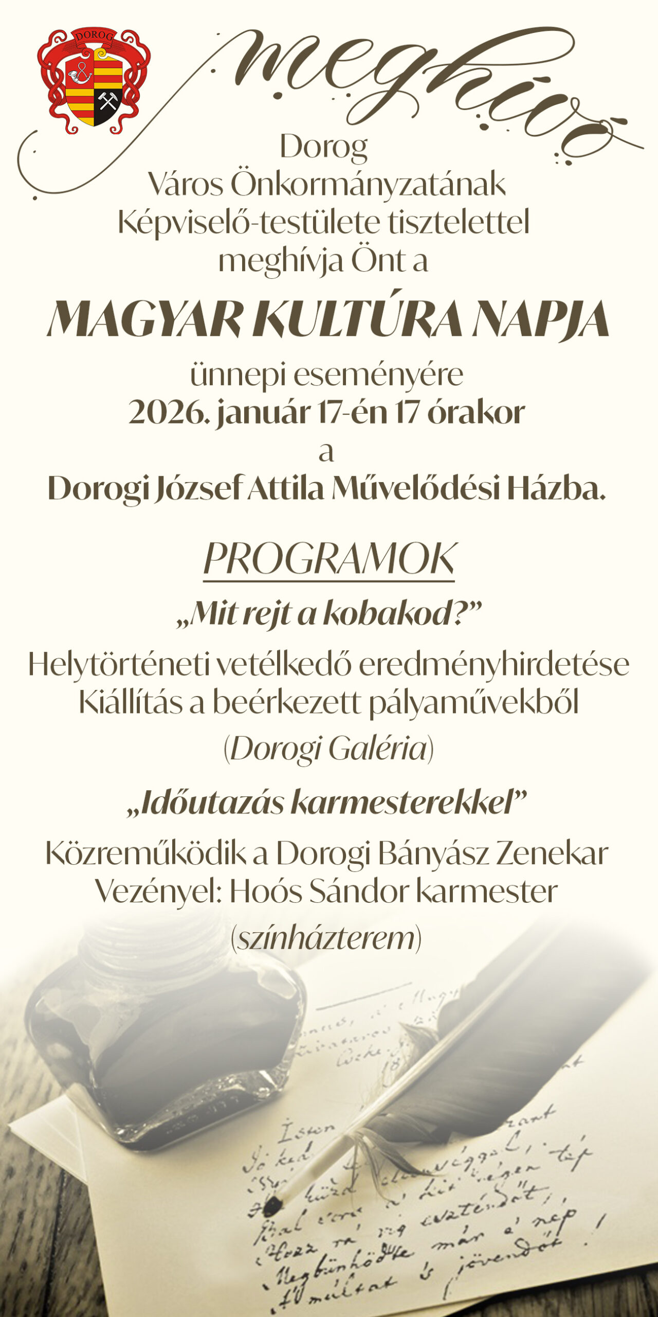 Dorog Város Önkormányzata ünnepi programmal készül a magyar kultúra napja alkalmából. A városi eseményt 2026. január 17-én, szombaton 17 órától rendezik meg a Dorogi József Attila Művelődési Ház épületében, ahová minden érdeklődőt szeretettel várnak.