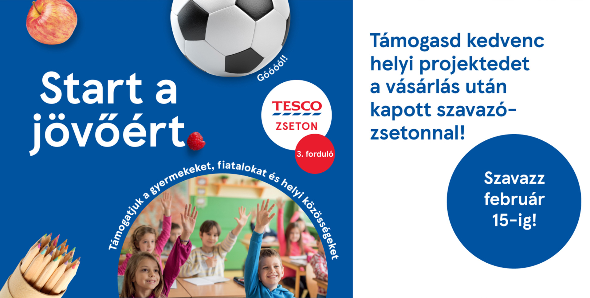 A Tesco tavaly ősszel immár harmadik alkalommal hirdette meg a fiatal generációk támogatására fókuszáló „Start a jövőért” pályázati programját, amelyre ezúttal is több mint 300 pályázat érkezett. A független szakmai bírálók értékelései alapján 171 projekt – köztük 9 Komárom-Esztergom vármegyei kezdeményezés – jutott tovább a most elindult szavazási szakaszba, ahol a vásárlók veszik szó szerint a kezükbe a döntést, és határoznak összesen 57 millió forint sorsáról. Országszerte 198, a vármegyében pedig 6 áruház pénztárainál február 15-ig minden vásárlás után járó zseton bedobásával ugyanis beleszólhatnak a támogatások elosztásába. Körzetenként így a legtöbb voksot gyűjtő szervezet 500 ezer, a második 300 ezer, a harmadik helyezett pedig 150 ezer forint támogatásban részesül.