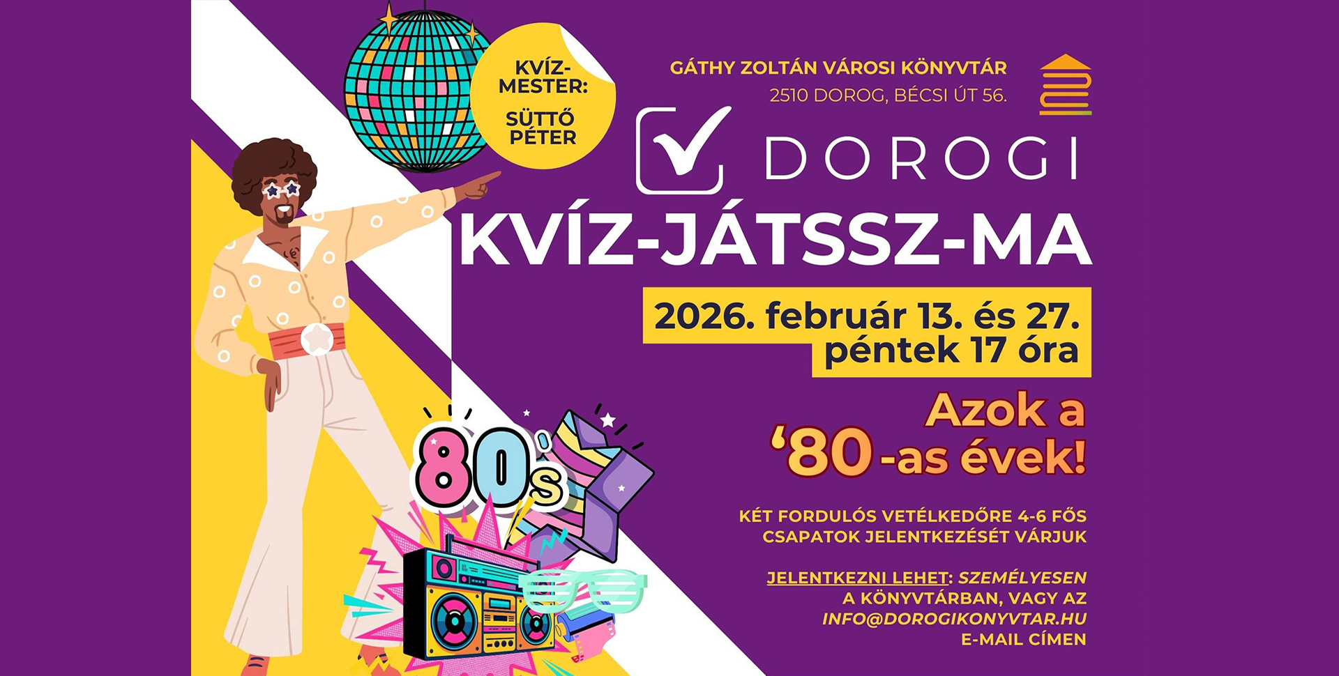 Válltömés, kazettás magnó, diszkógömb és legendás slágerek – februárban a nyolcvanas évek hangulata költözik Dorogra. A Gáthy Zoltán Városi Könyvtár felkérésére indul a „Dorogi Kvíz-játssz-ma” programsorozat részeként az „Azok a ’80-as évek!” című, kétfordulós kvízjáték.