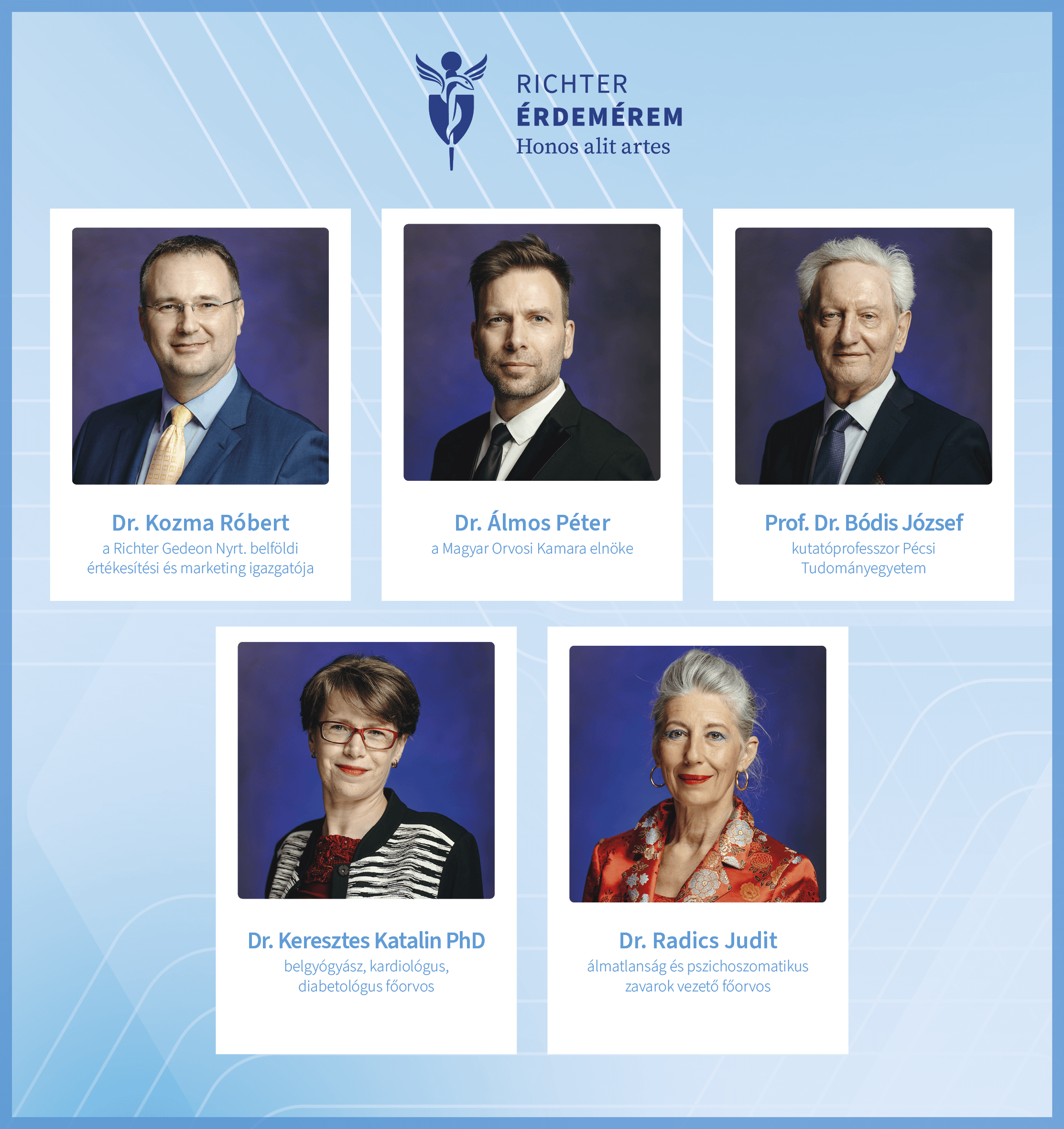 „A szakorvosok munkája nemcsak az egészségügy, hanem az egész társadalom működése szempontjából meghatározó. A Richter Érdemérem Díj rámutat arra, hogy az orvosi hivatás milyen jelentőséggel bír, és milyen áldozatvállalás áll mögötte. A díjazott pályaművek bemutatása kiváló alkalom arra is, hogy szélesebb körben láthatóvá váljon: a szakorvosok elkötelezettsége nélkülözhetetlen mindennapi életünkben” – hangsúlyozta Dr. Álmos Péter, a Magyar Orvosi Kamara elnöke.