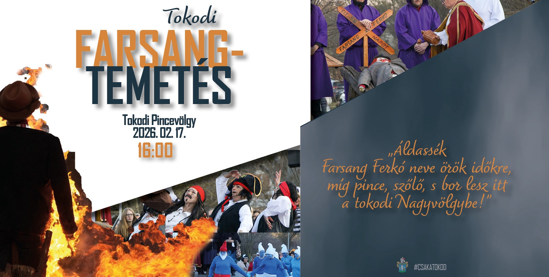 Idén is megrendezik Tokodon az egyik legnépszerűbb közösségi eseményt: a hagyományos farsangtemetést. A Tokod Nagyközség Önkormányzata szeretettel hívja az érdeklődőket 2026. február 17-én, húshagyó kedden 16 órára a tokodi pincevölgy területére, ahol ismét ál-szomorú, mégis vidám hangulatban búcsúztatják a farsangot és a telet.