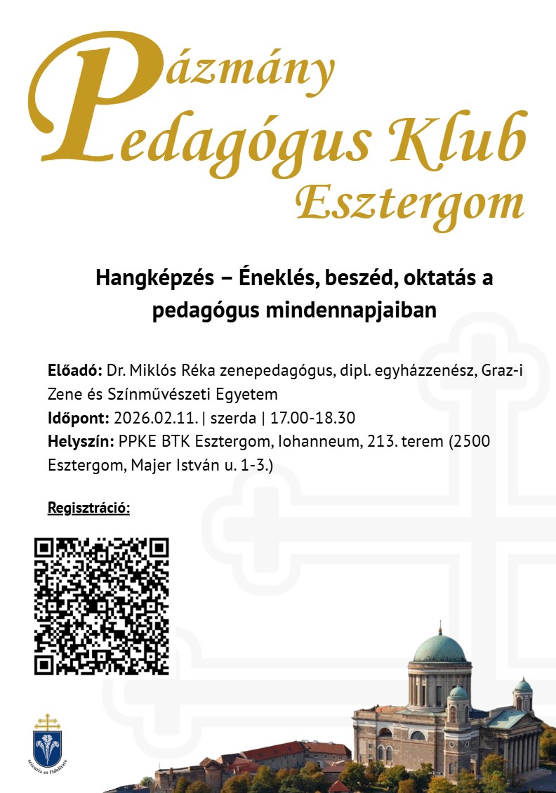 A Pázmány Pedagógus Klub következő alkalma 2026. február 11-én, szerdán 17 órakor várja az érdeklődőket Esztergomban. Az előadás és workshop középpontjában a hangképzés áll, különös tekintettel az éneklésre, a beszédre és ezek szerepére a pedagógus mindennapjaiban.