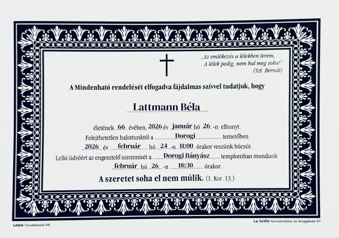 Családja most közzétette a temetés időpontját. Tájékoztatásuk szerint Lattmann Bélát 2026. február 24-én, kedden 11 órakor helyezik örök nyugalomra a dorogi temetőben. Lelki üdvéért az engesztelő szentmisét 2026. február 26-án, csütörtökön 18 óra 30 perckor mutatják be a Dorogi Bányász templomban.