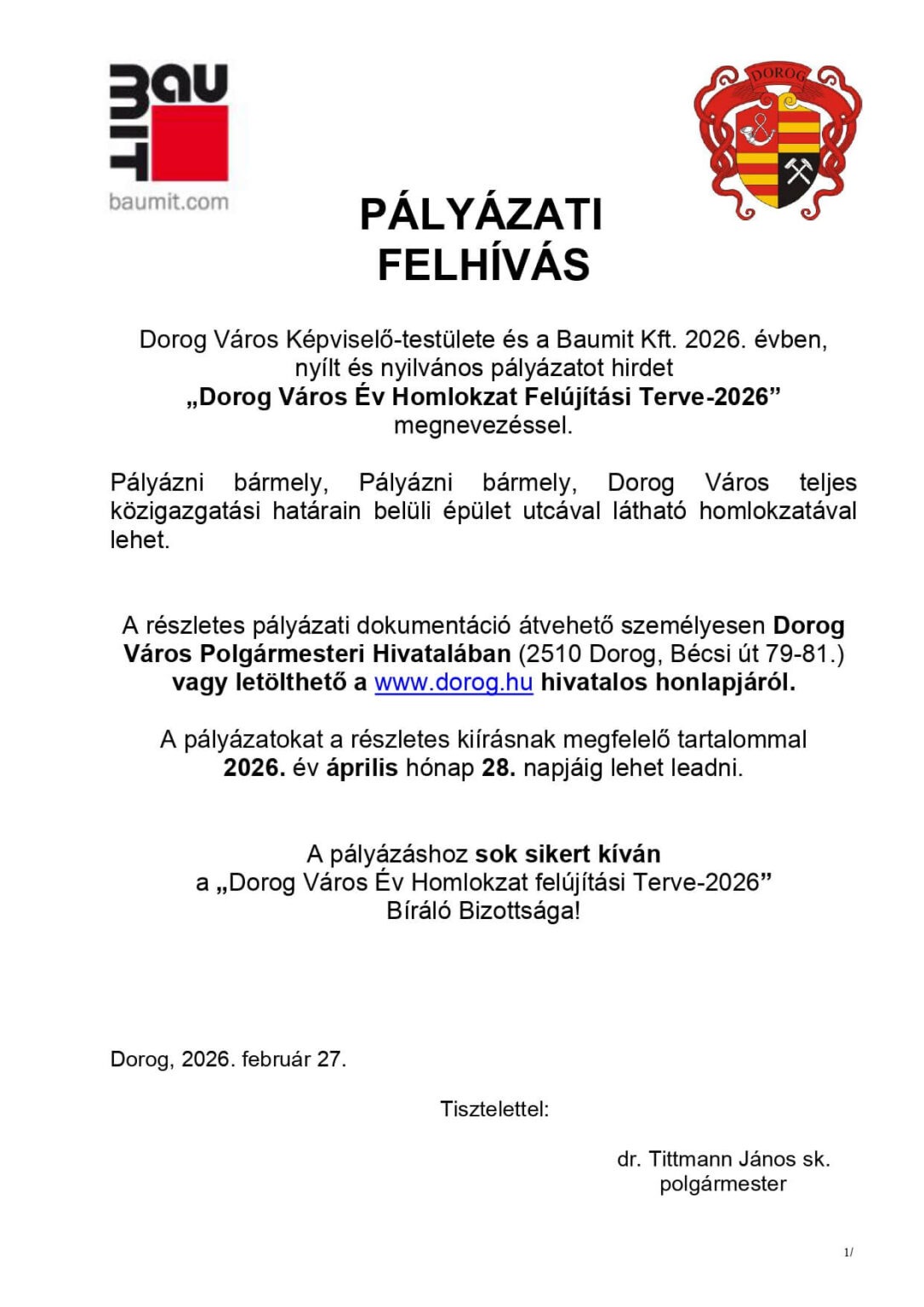 Dorog Város Önkormányzata és a Baumit Kft. 2026-ban is meghirdeti a „Dorog Város Év Homlokzat Felújítási Terve–2026” elnevezésű, nyílt és nyilvános pályázatot.