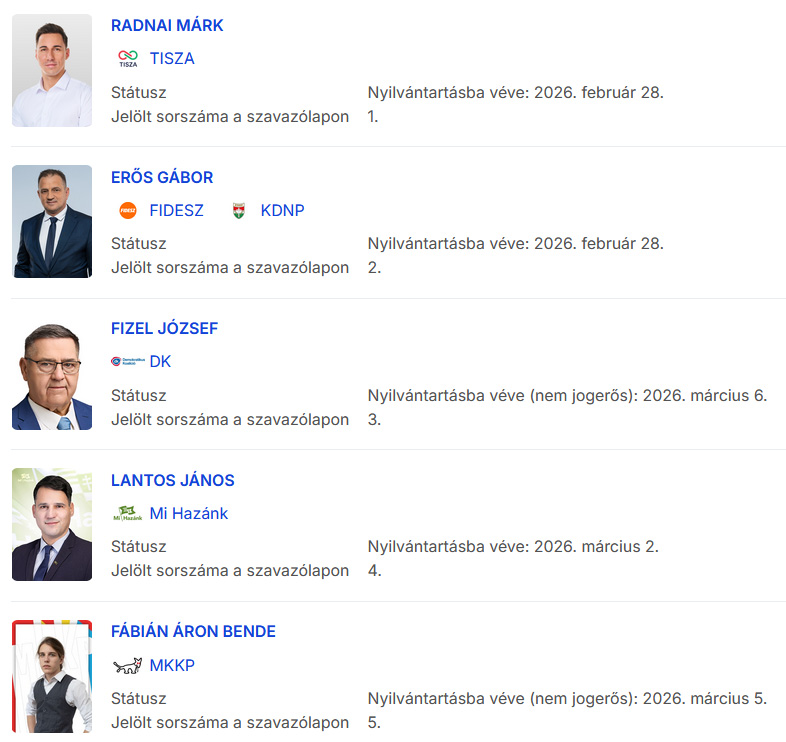 Március 6-án lezárult az ajánlóívek leadási határideje a 2026-os országgyűlési választások előtt, így eldőlt, hogy kik indulhatnak az egyéni választókerületekben. A Nemzeti Választási Iroda adatai szerint Komárom-Esztergom vármegye 02-es számú egyéni választókerületében több jelöltet is nyilvántartásba vettek.