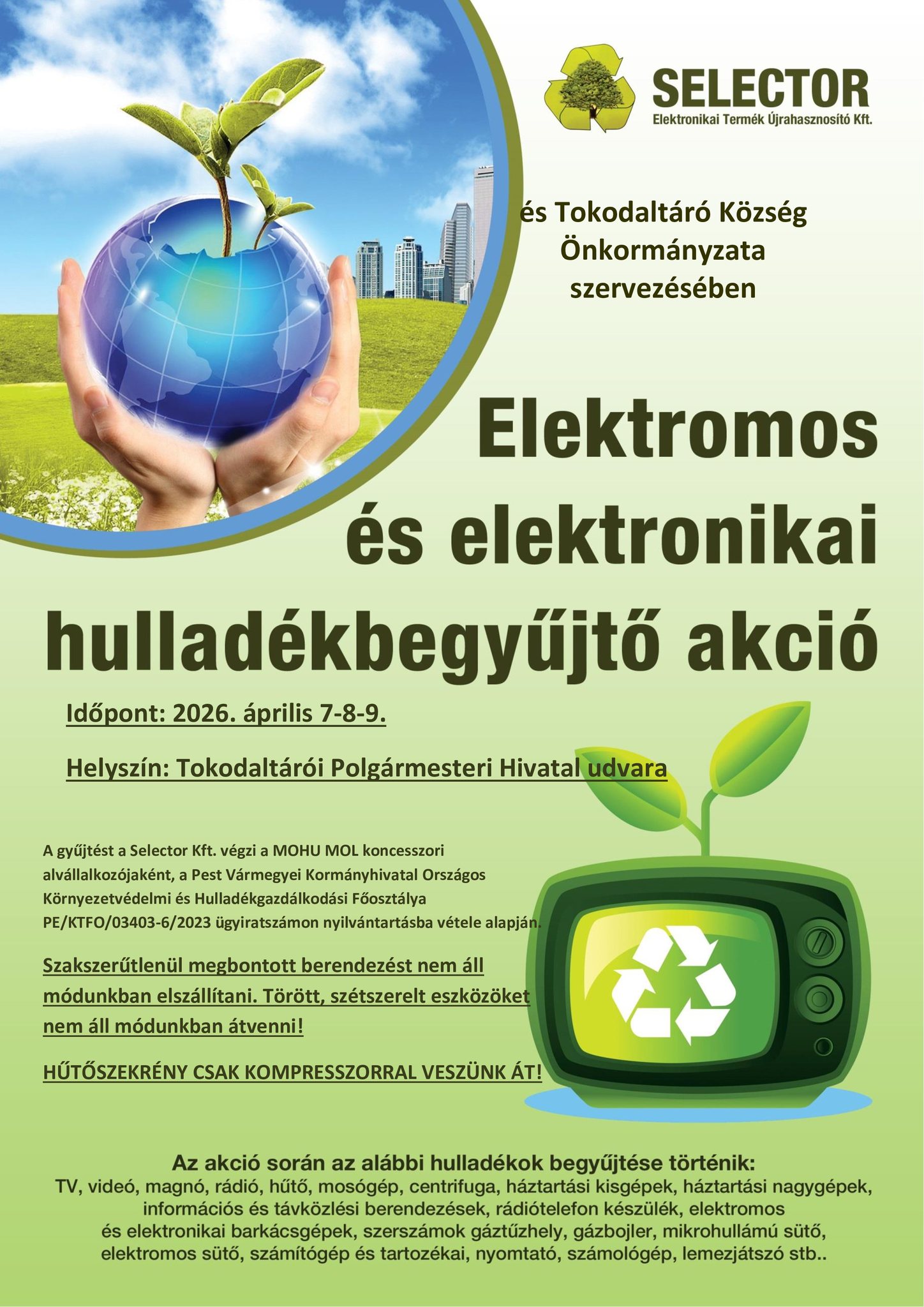 Elektronikai és elektromos hulladékbegyűjtő akciót szerveznek Tokodaltárón április 7. és 9. között a Tokodaltáró Község Önkormányzata és a Selector Elektronikai Termék Újrahasznosító Kft. együttműködésében.
