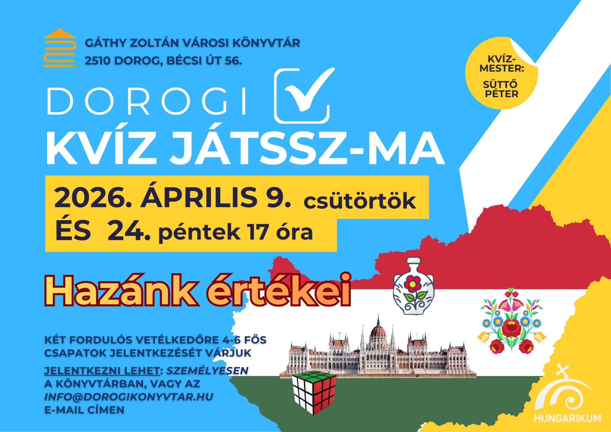 Folytatódik a Dorogi Kvíz Játssz-Ma sorozat a Gáthy Zoltán Városi Könyvtárban, ahol ezúttal „Hazánk értékei” témában mérhetik össze tudásukat a vállalkozó kedvű csapatok.