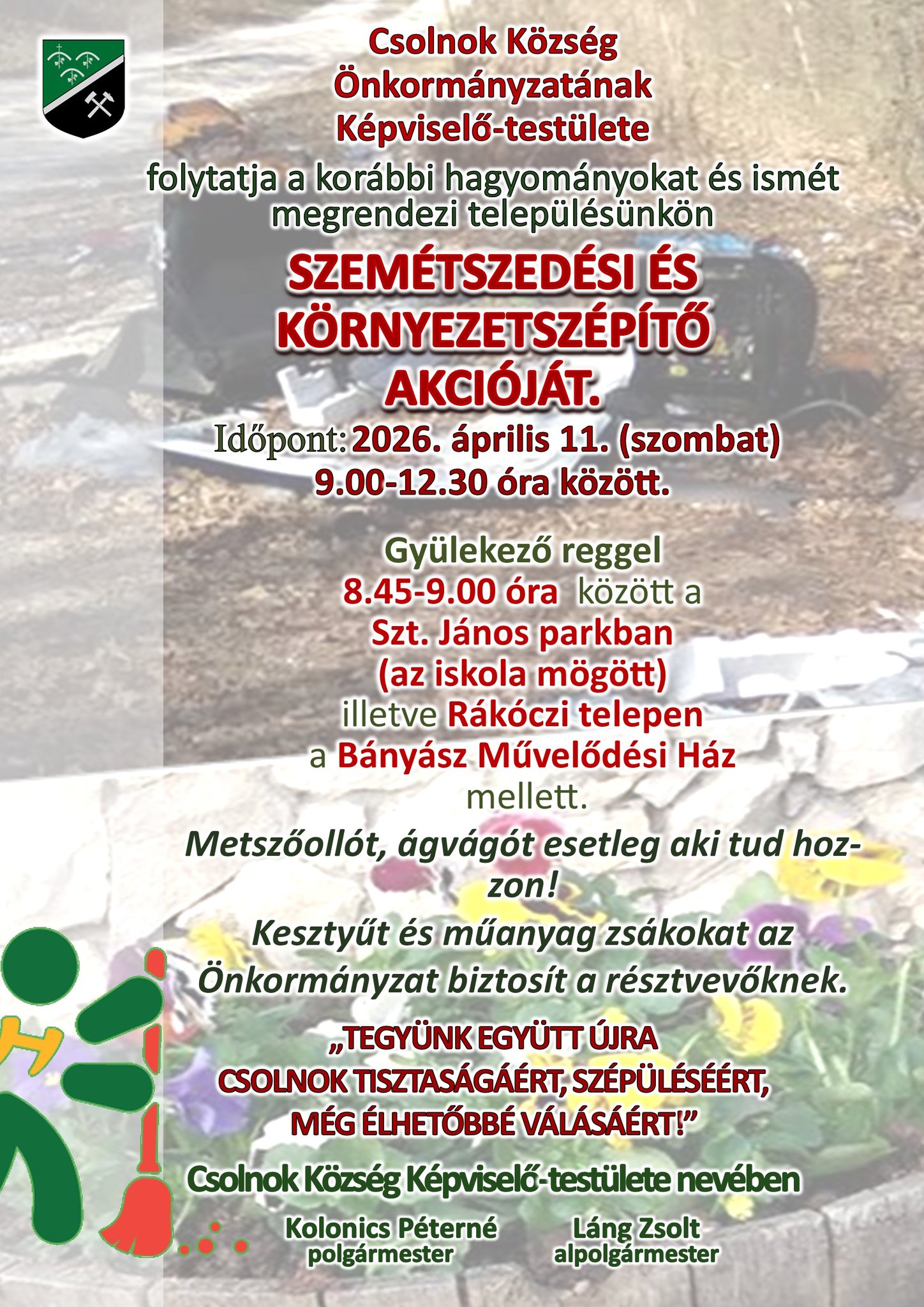 Csolnok Község Önkormányzata idén is folytatja a hagyományokat: április 11-én, szombaton közös szemétszedési és környezetszépítő akcióra hívják a település lakóit.