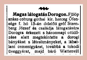 1926 áprilisában különleges vendég érkezett Dorogra: Fülöp szász–coburg–gothai királyi herceg három napot töltött a településen. A királyi fenséget a Schmidt család fogadta; vendéglátója dr. Schmidt Sándor leányának, Sárának férje, gróf Sternberg József volt.