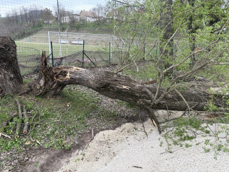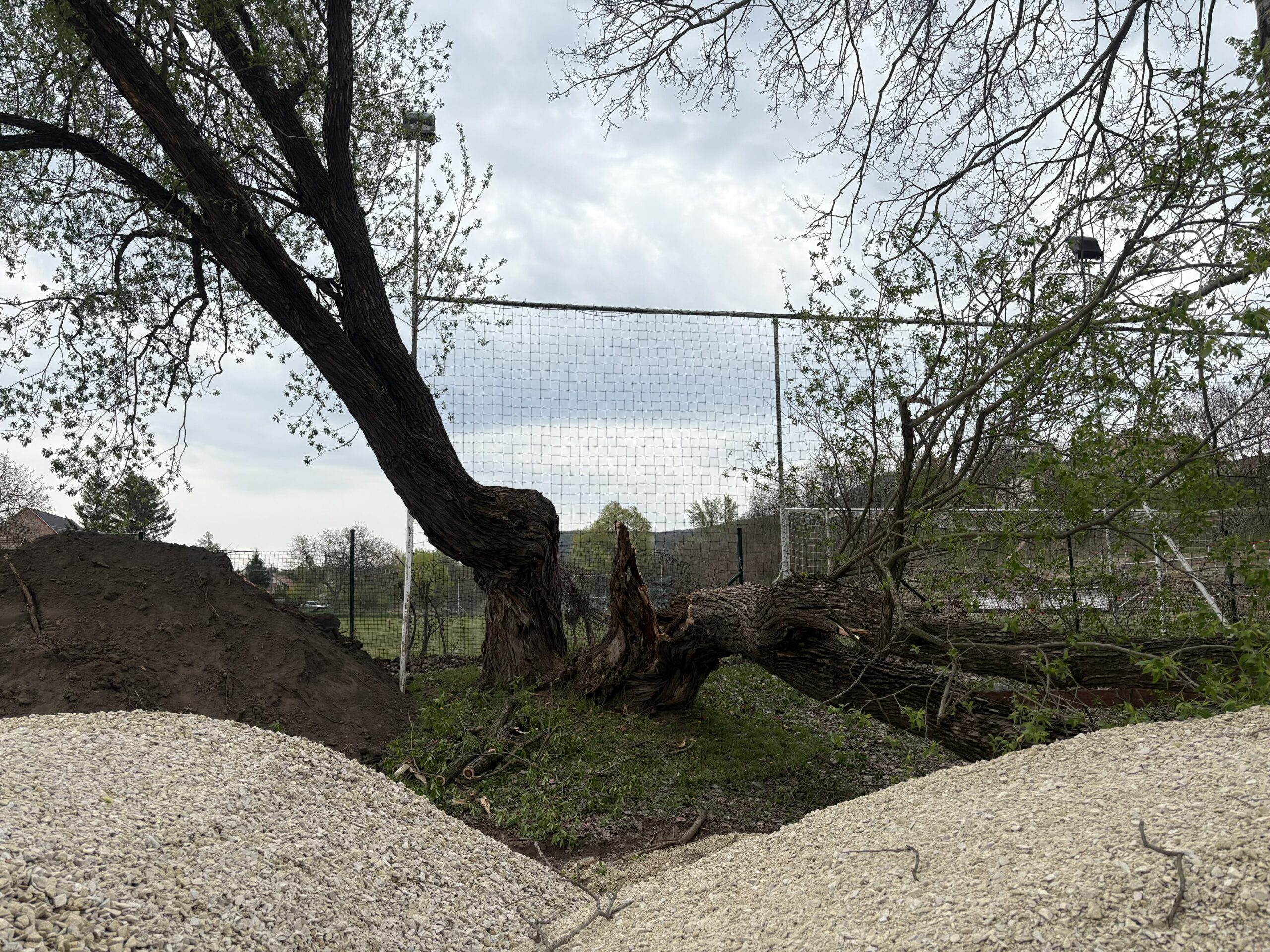 Veszélyesen megdőlt egy fa április 15-én, szerdán délelőtt Tokodon, a Lukácsi Máté Művelődési Ház udvarán.