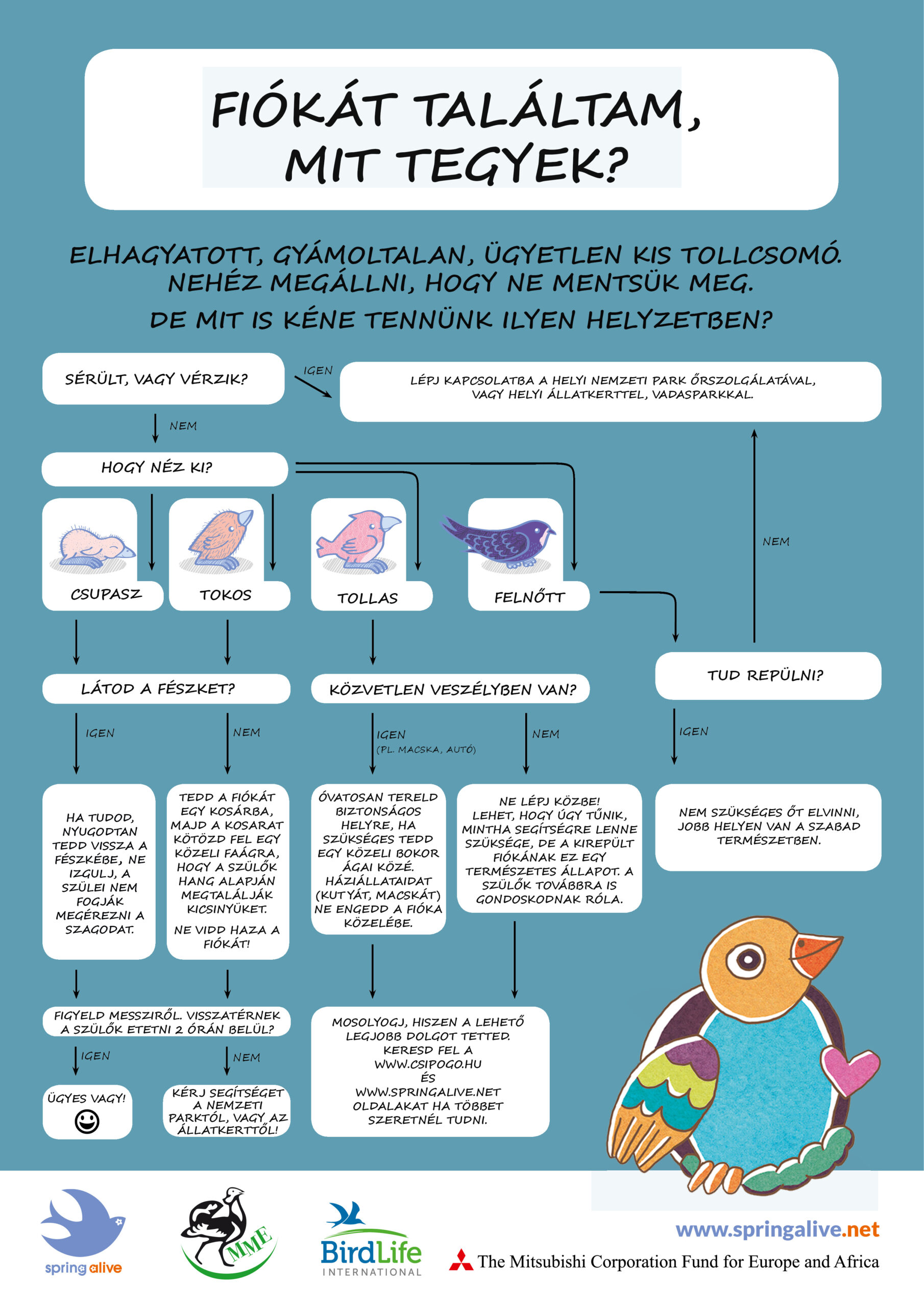 A kis és közepes testű madárfajokra általánosan jellemző, hogy fiókáik a teljes röpképesség elérése előtt elhagyják a fészket, és a környék sűrű aljnövényzetében bujkálva hívják magukhoz etető szüleiket. Az emberek többnyire ilyen tollas, nem menekülő, magányosnak tűnő fiókákkal találkoznak az utcán, a parkban, a kertben a földön ücsörögve, gyakran hangosan csipogva. A látszat ellenére azonban ezek a fiatalok nem árvák, a táplálékot kereső szüleik valahol a közelben vannak, ezért szükségtelen, sőt, a madarak számára kifejezetten káros, ha haza visszük őket. Mi ugyanis nem tudjuk megtanítani a fiókákat a túlélésükhöz nélkülözhetetlen viselkedési formákra, ráadásul a szülők által hordottnál sokkal gyengébb minőségű élelemmel táplálva a fiatalokat maradandó egészségkárosodást is okozhatunk nekik.